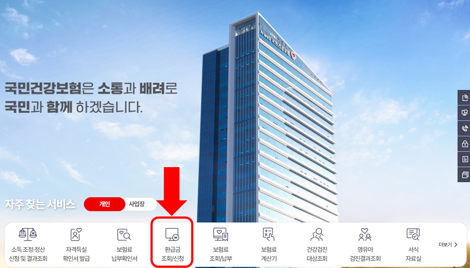 국민건강보험공단 홈페이지에서 환급금 조회 및 신청 메뉴를 통해 접속하실 수 있습니다.