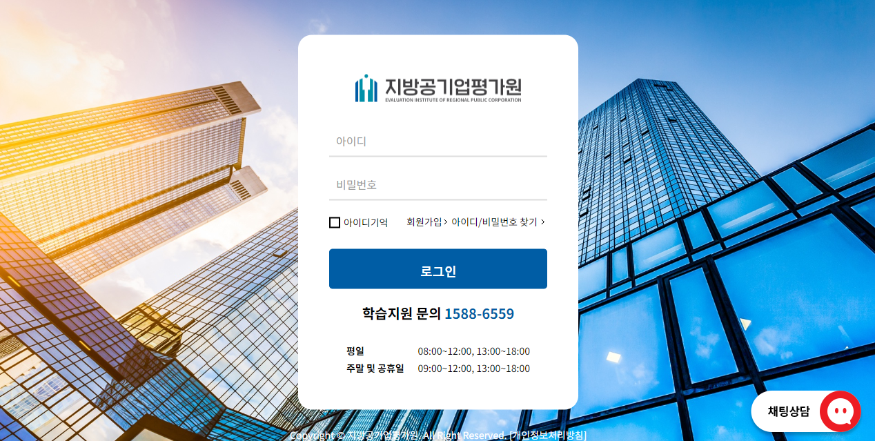 학습지원 문의 1588-6559 평일 08:00~12:00, 13:00~18:00 주말 및 공휴일 09:00~12:00, 13:00~18:00 Copyright © 지방공기업평가원. All Right Reserved. [개인정보처리방침]